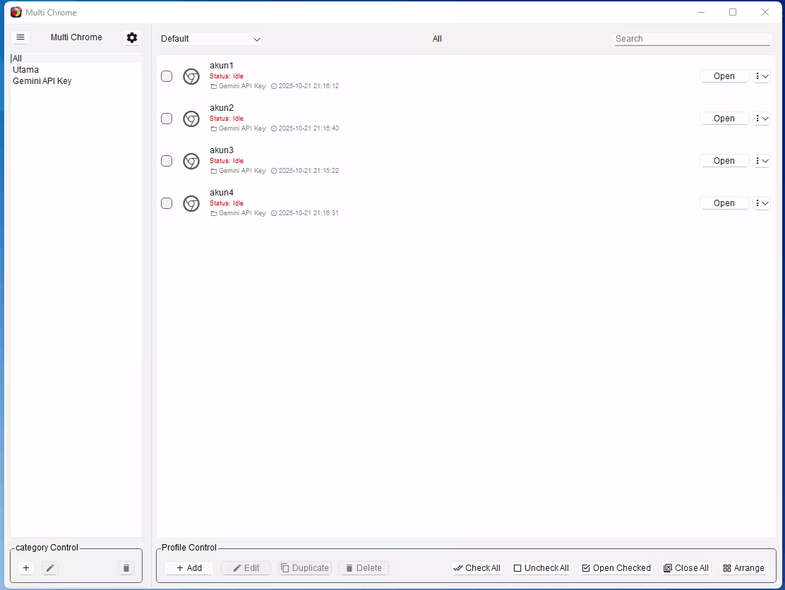 berikut tampilannya, multi chrome aplikasi untuk manajemen profil chrome dengan mudah